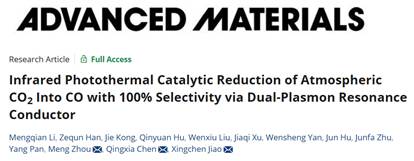 近期,我校化工学院焦星辰教授课题组在CO2催化转化方面取得重要进展,研究成果“Infrared Photothermal Catalytic Reduction of Atmospheric CO2Into CO with 100% Selectivity via Dual-Plasmon Resonance Conductor”在线发表于Adv. Mater. (//doi.org/10.1002/adma.202503021),“Infrared-Light-Driven CO2Reduction Realized by a Charge-Asymmetrical Metallic Conductor”在线发表于Nano letters (//doi.org/10.1021/acs.nanolett.5c01505)。