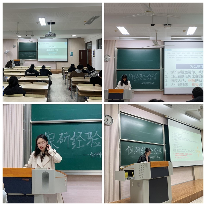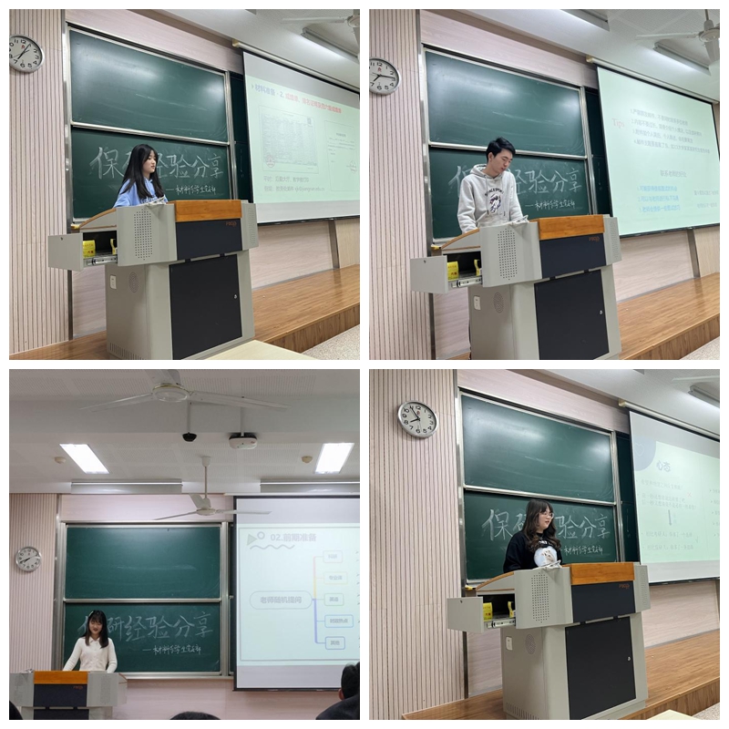 陈梦瑶同学现已保研至中科院宁波材料所。她为同学们详细介绍了保研流程,并用生动贴切的生活实例进行类比,帮助大家加深理解;鼓励同学们积极参与科创活动,提高自己在保研中的核心竞争力。此外,她也结合自身的经历,针对“社恐”如何寻找导师和“高校or研究所”等问题进行了分享,语言风趣,现场气氛热烈。欧凯琴同学现已保研至复旦大学。她为同学们分享了院校选择的经验,首先要根据自身的目标和本科学校的水平选择心仪的梦校,在夏令营、预推免、九推等不同阶段当中有选择性地投递,并且将自身的能力特长与相关院校的招生期望进行自洽。作为一名优秀的保研学子,她在众多院校面试通过的经历也为学弟学妹们带来了宝贵的经验。陈佩茹同学现已保研至浙江大学。她针对各类保研文书的准备,为大家进行了详细的介绍,从相关证件、荣誉证书、自我介绍、简历、PPT制作、专家推荐信等多方面,为大家分析这其中的逻辑和针对性话术;也向同学们推荐了在文书准备过程中较为实用的App和网站,干货满满。张明通同学现已保研至中国科学技术大学。他结合自身经历,向同学们分享了在选择和联系导师过程当中的经验。从导师的年龄、头衔、研究方向等不同角度,为同学们详细分析了其中的优缺点;也教大家如何利用网络信息寻找到自己心仪的老师。语言幽默风趣,结合身边实例和自身经历,为同学们提供了参考。董媛同学现已保研至浙江大学。在她的分享过程当中,列举了来自不同高校的大量真题,从专业知识、科研经历以及英语问答等,为同学们提供了宝贵的第一手消息。她强调,一定要对自己的科创经历非常熟悉;同时,她也向大家分享了一些实用的面试技巧,如何在面试中扬长避短,展示自己。赵思雨同学现已保研至华南理工大学。她则从“保研边缘人”这样一个特殊的视角,为大家分享了平衡保研和考研这两件事情的独到经验,二者在时间线上的关键节点并不重合,合理安排可以为自己带来更多的机会。压力固然有之,但更多的是动力;柳暗花明,殊途同归的那一刻,双倍的努力带来的是双份的喜悦。林杰荧同学现已保研至中国科学技术大学。在参加竞赛方面,她为同学们提出了切实有效的多种路径。丰富翔实的竞赛经历,不仅仅是外校面试时的核心竞争力,也是本校保研名额的重要加分项。此外,她也以自己独到的视角,为同学们分享了保研路上缓解焦虑的好方法。