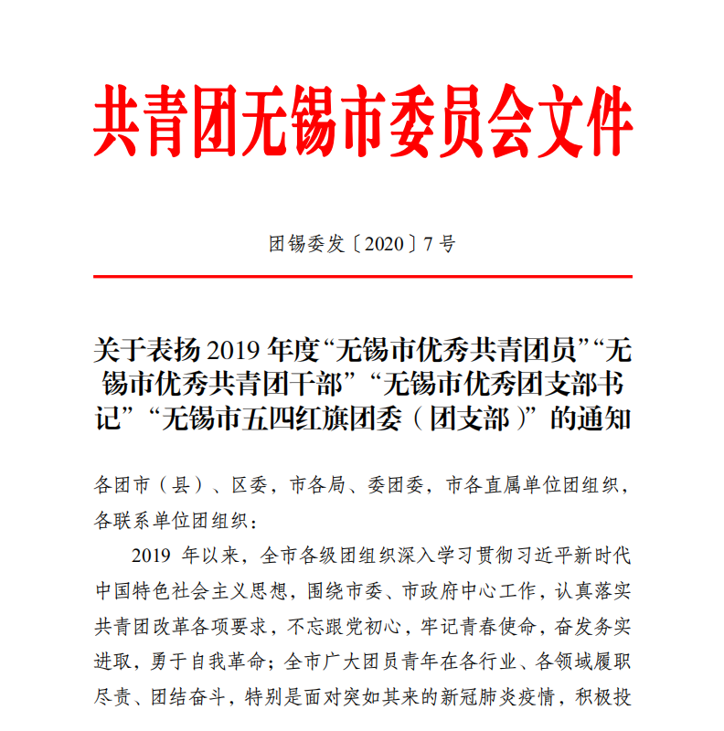 近日,共青团无锡市委员会发布《共青团无锡市委员会关于表扬2019年度“无锡市优秀共青团员”“无锡市优秀共青团干部”“无锡市优秀团支部书记”“无锡市五四红旗团委(团支部)”的通知》,共青团91视频