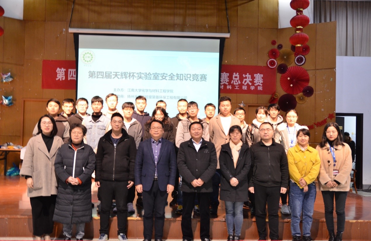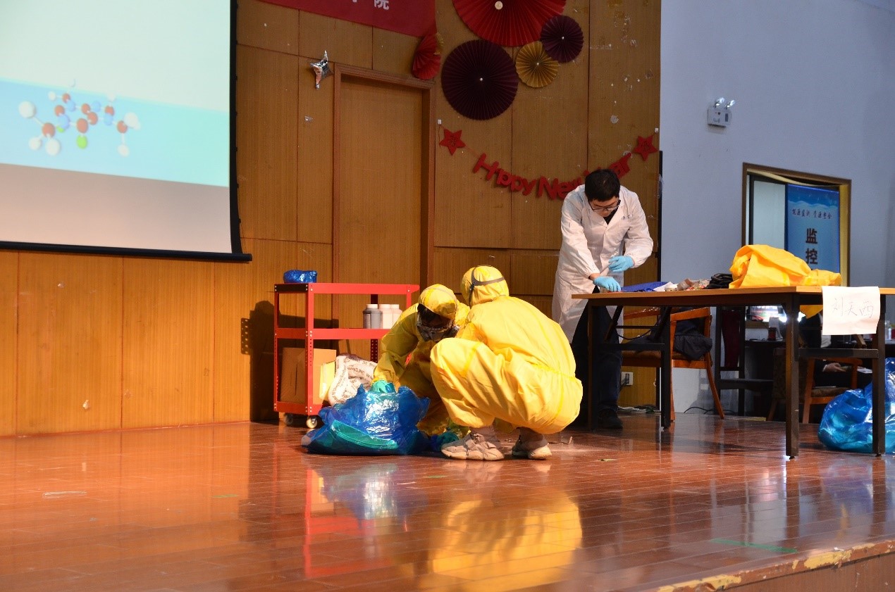 安全意识建立的促动效果表示肯定。在经过两轮激烈的角逐,来自刘天西和杜明亮团队的两支队伍进入总决赛,最后的操作题采用了情景模拟的方式,在舞台上为比赛选手模拟出实验室突发事故的现场,要求学生组成应急小组进行现场操作,从防护服、防护面罩等的穿戴到进入突发现场处理破碎的试剂瓶与地上的“浓盐酸”,在从理论知识走向应急处置的过程中,选手的实际操作存在一些不足与隐患。最终,刘天西团队以更加细致严谨的操作获得了本次比赛的一等奖,杜明亮团队荣获二等奖,许虎君和宋启军团队获得三等奖,东为富和王海军团队获得优胜奖,各评委老师及特邀嘉宾为参赛选手进行了颁奖并合影留念。