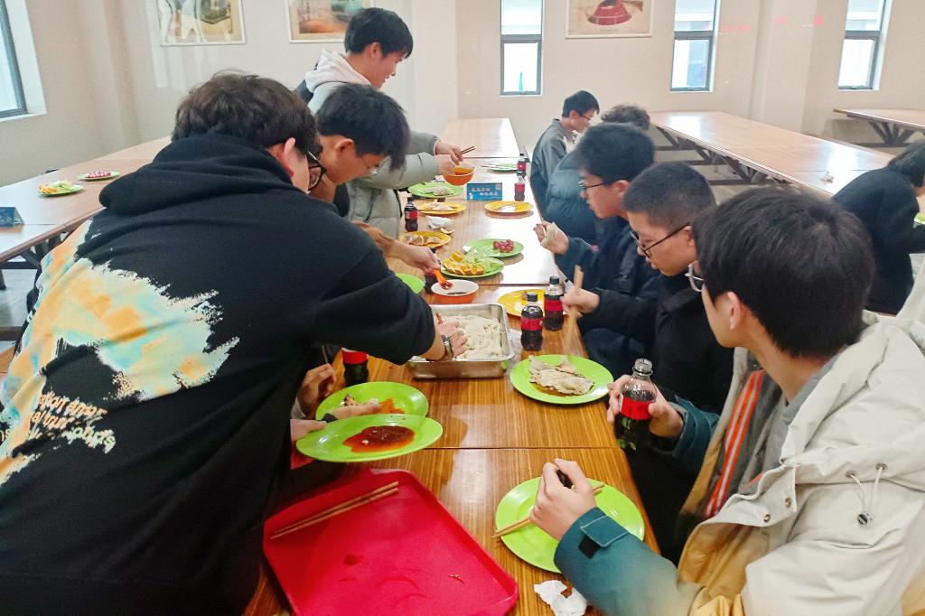 不久后热气腾腾的饺子就出现在了大家面前。同学们迫不及待地领取餐盘品尝自己的“佳作”,同时还有班委精心准备的饮料和水果,大家都吃得津津有味、其乐融融。吃完饺子,班委又组织了一些小游戏,同学们争相参与。来自全国各地的同学沉浸地投入到班级的团建之中。