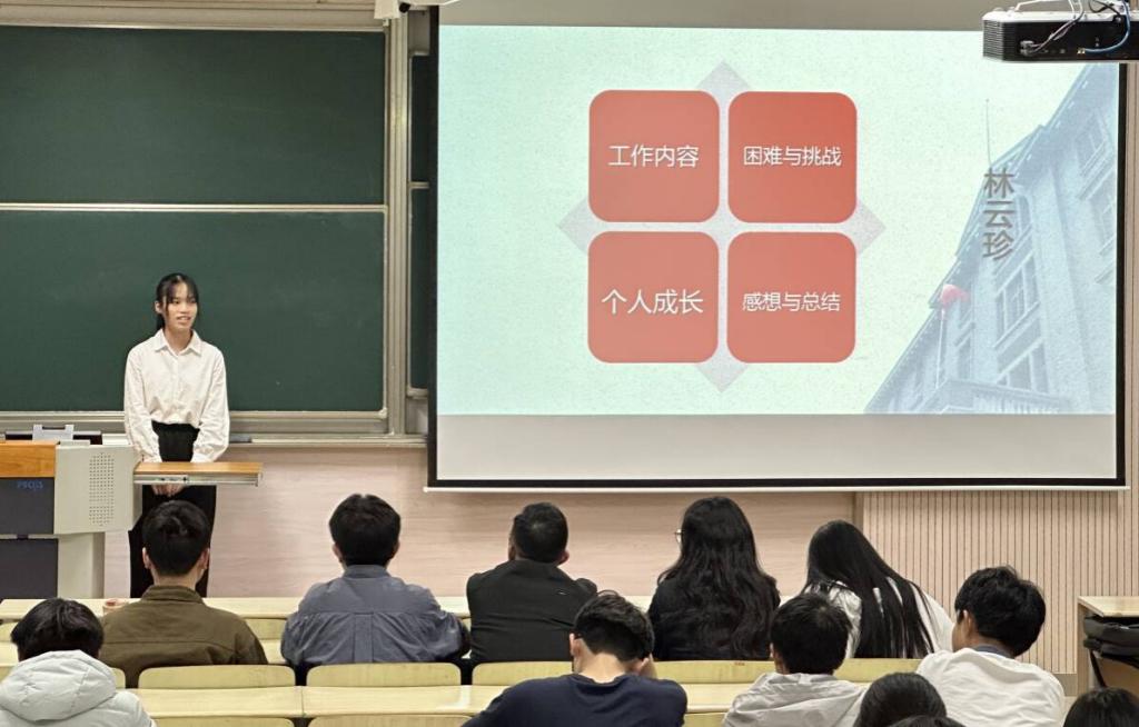 在二教2C211教室举办第二届“光辉的足迹”实践故事报告会暨信仰公开课。学院分团委书记鞠峰、2021级辅导员郝林青、2023级辅导员马航威、“鼋访风华”实践团负责人鲁士杰、张诗茹出席本次活动并担任评审,2023级100余名本科生参加了活动,活动由张林曼、祝方平主持。