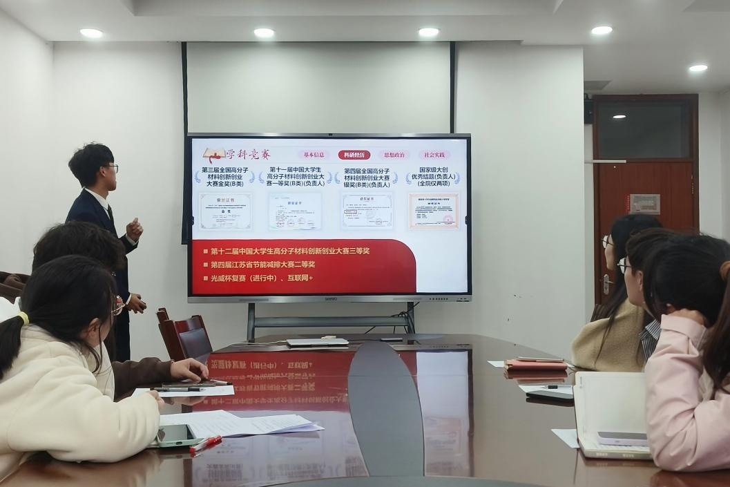 于化工楼A308会议室举行了2024下半年预备党员转正答辩会。本次答辩评委小组由学院党委副书记董霞,党建辅导员郝林青,学生党支部书记代表李家豪、李玉杰、陈依梅组成,17名预备党员参与本次答辩。
