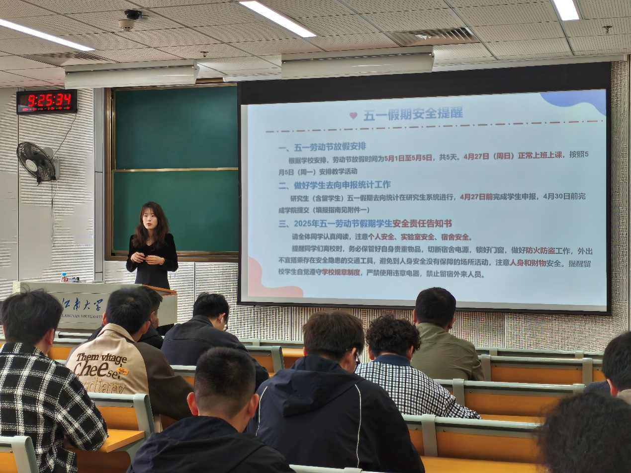针对即将到来的五一假期,李晓洁围绕实验室安全管理工作作出相关安排:一要强化安全责任意识,离校前严格落实实验室安全检查制度,切实做好设备断电、危化品归置及防火防盗工作;二要发挥网格化管理效能,对假期留校学生实施动态管理,严格执行实验室安全巡查和登记制度;三要建立突发事件预案,畅通信息报送渠道,确保安全管理工作不留死角。