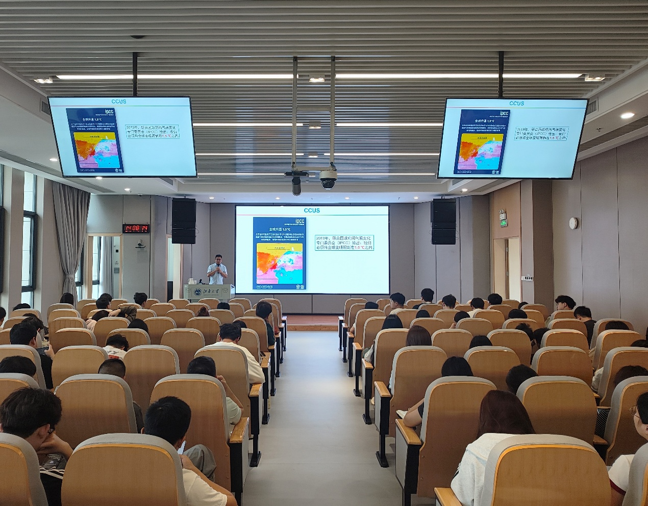 东氿校区知行楼C106报告厅内举行。校聘教授、博士生导师焦星辰教授应邀为师生带来了一场题为“二氧化碳的资源化利用”的精彩学术讲座,现场学术氛围浓厚,与会学生热情高涨。