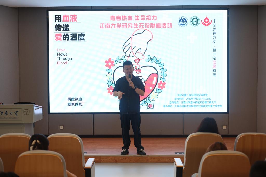2023级研究生第二党支部组织举办,党支部书记程子涵主持活动,旨在普及献血知识,弘扬奉献精神。并随后在知行楼二楼大厅开展了爱心献血活动。宜兴市红十字会血站党支部书记、站长潘迎霞,副站长王云霞,化工学院辅导员李晓洁出席本次活动。