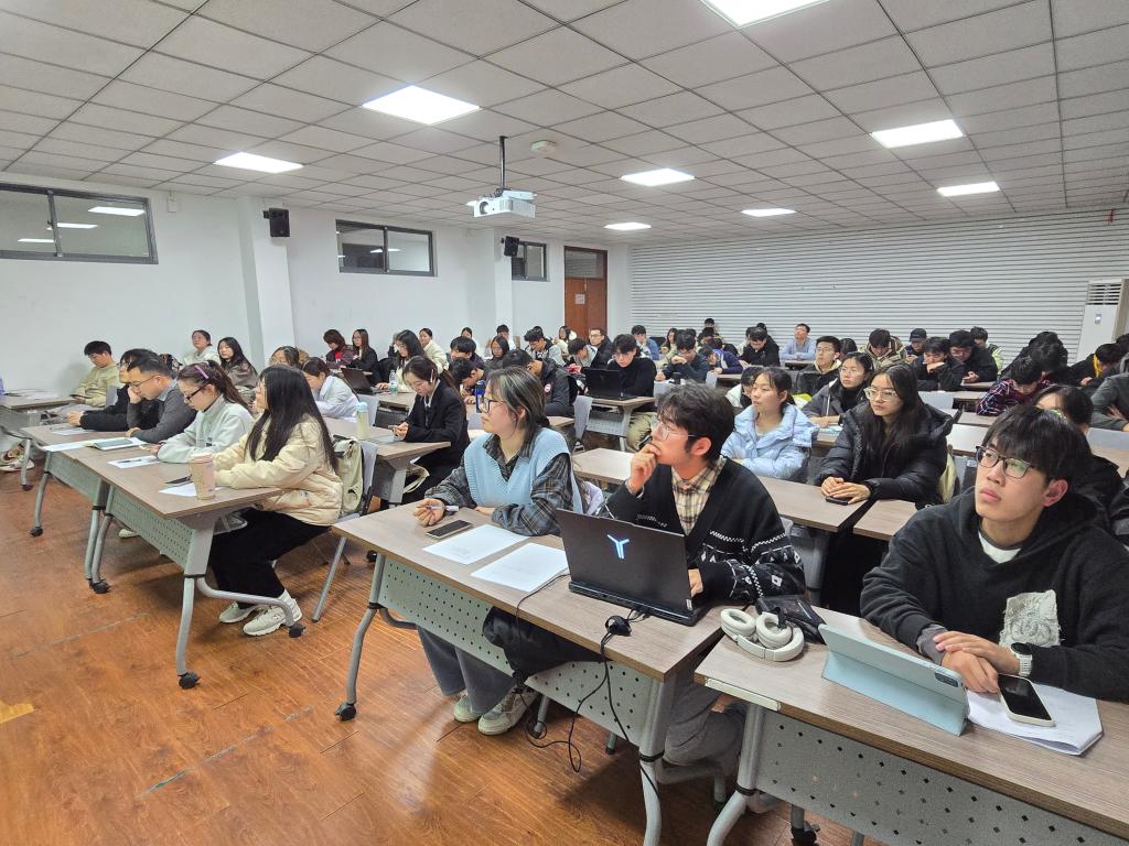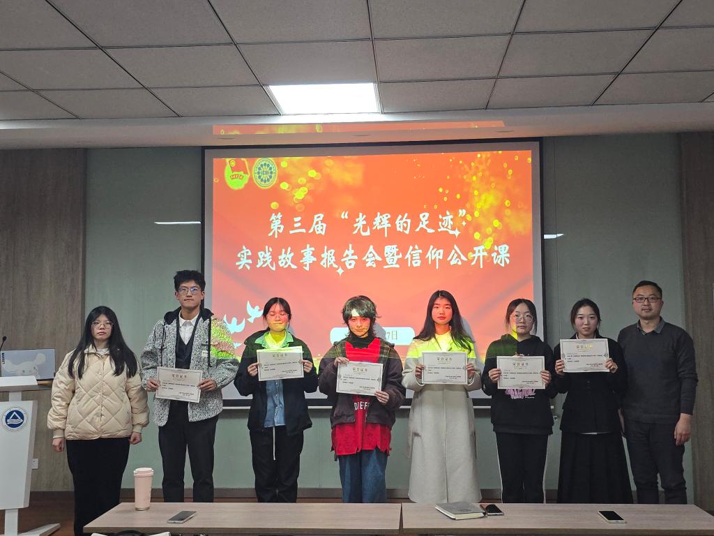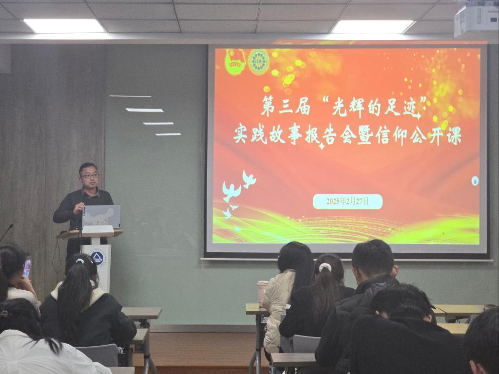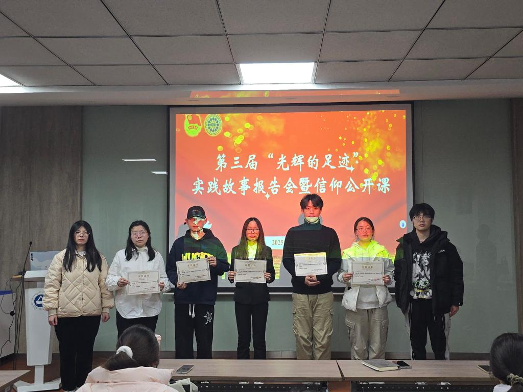 在化工楼A316举办第三届“光辉的足迹”实践故事报告会暨信仰公开课。学院学工办主任兼分团委书记鞠峰、2024级辅导员马之禾、“鼋访风华”实践团负责人张林曼、隽鸿博出席活动并担任评审,2024级60余名本科生参加了活动,活动由朱思盈、靖朝阳主持。