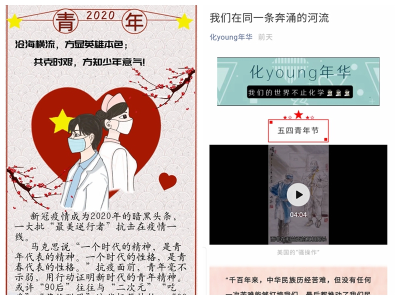 突如其来的疫情,是一次全球大考,也是一堂“面对突发疫情青年人该怎么做”的生动课程。疫情期间,化工学子虽居于一隅却始终保持世界眼光,密切关注世界疫情发展趋势,冷静分析世界变幻格局,细心收集,客观研判。分团委各部门联合制作微视频《我们在同一条奔涌的河流》,于5月4日当天在学院微信平台推出。视频以独特的青年视角和生动幽默的语言析说疫情中的“中美方案”,剖析疫情彰显出的制度优势、道路优势,引导广大共青团员牢记“四个意识”,坚定“四个自信”,做到“两个维护”,将青春梦想融入时代担当,立志为实现中华民族伟大复兴做出更大的贡献。