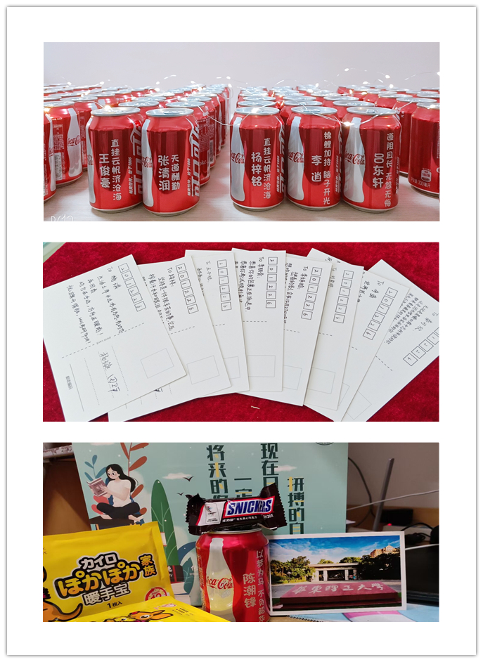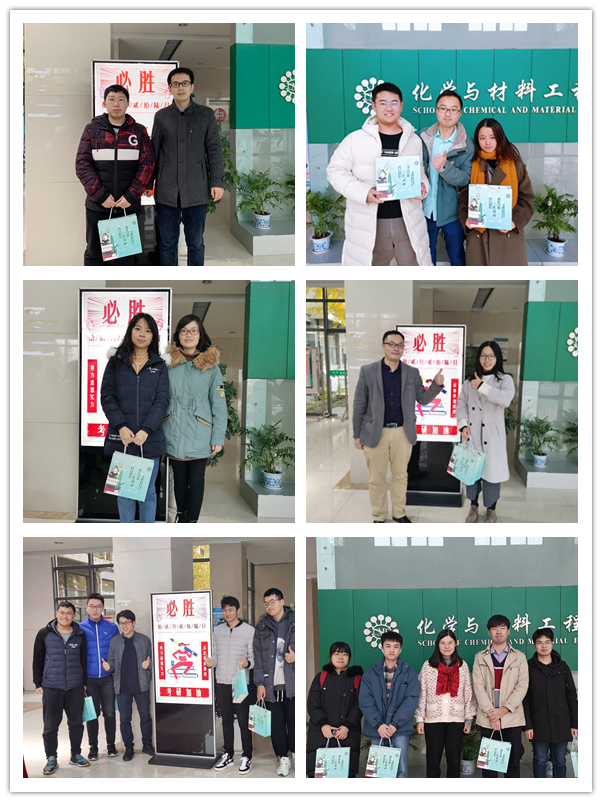 考研慰问品装在专门为化工考研学子定制的加油包中,加油包中有印有祝福语的可乐、暖手宝、士力架,还有由班主任、辅导员、班级同学手写的,印有报考院校照片的明信片。希望考研学子“喝了冰可乐,精神爽爽的;捧着暖宝宝,心里暖暖的;吃了士力架,能量满满的;看了明信片,信心足足的;坚持拼到底,升学稳稳的”。在场老师关切地询问考研同学近期的复习情况,关心他们有没有遇到困难,嘱咐他们注意劳逸结合、饮食规律、防寒保暖,鼓励他们努力到最后一场考试结束,祝愿他们成功考取理想中的院校。