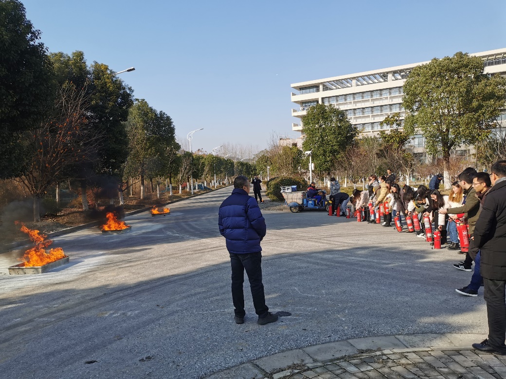 在协同创新大楼南侧空地的灭火作业演习现场,校保卫处消防科涂科长向大家详细介绍了干粉灭火器的使用方法,先拔出灭火器的栓销,一手抓稳把手,一手抬起喷嘴,在距离火源两米左右的位置,对准火源根部喷射。在随后的灭火实地演练中,学员们每十五人左右一组分批次进行灭火操作。在涂科长的精心指导下,学员手持灭火器站到安全位置,手持喷嘴对准火苗,迅速将盆内明火扑灭。随着最后一组学员扑灭火焰,本次演习活动落下帷幕。