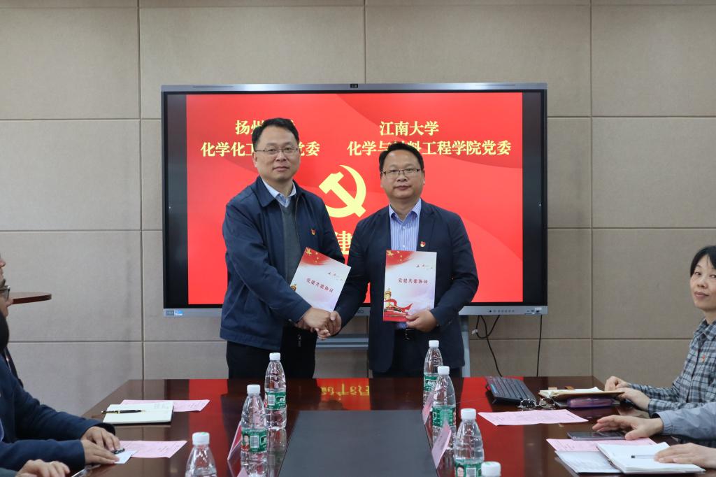 党委潘庆伟书记与扬州大学化学化工学院党委娄金海书记代表双方党委签署了共建协议书。潘庆伟在讲话中表示,目前正值主题教育活动如火如荼开展之际,双方学院党委的次共建,正是贯彻落实习近平新时代中国特色社会主义思想和党的二十大精神为指导的重要举措,双方将积极构建“共建、共创、共享、共赢”的党建共建格局,促进党的各项工作扎实落地,为共同推动学院事业高质量发展引航助力。娄金海在讲话中指出,希望双方能通过建设平台、共享资源、交流经验、解决问题等途径,凝聚合力,共筑组织基础、共办实事好事、共谋双方发展,建立党建与业务工作的互促互助、发展共赢。