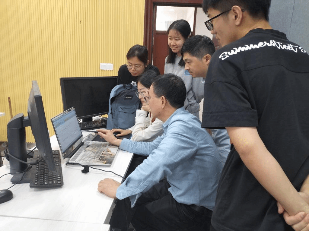 指导老师与学生在机房交流