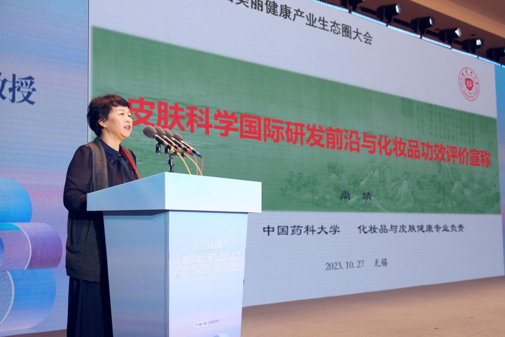 中国药科大学中药学院教授尚靖作《皮肤科学国际研发前沿与化妆品功效评价宣称》主题报告