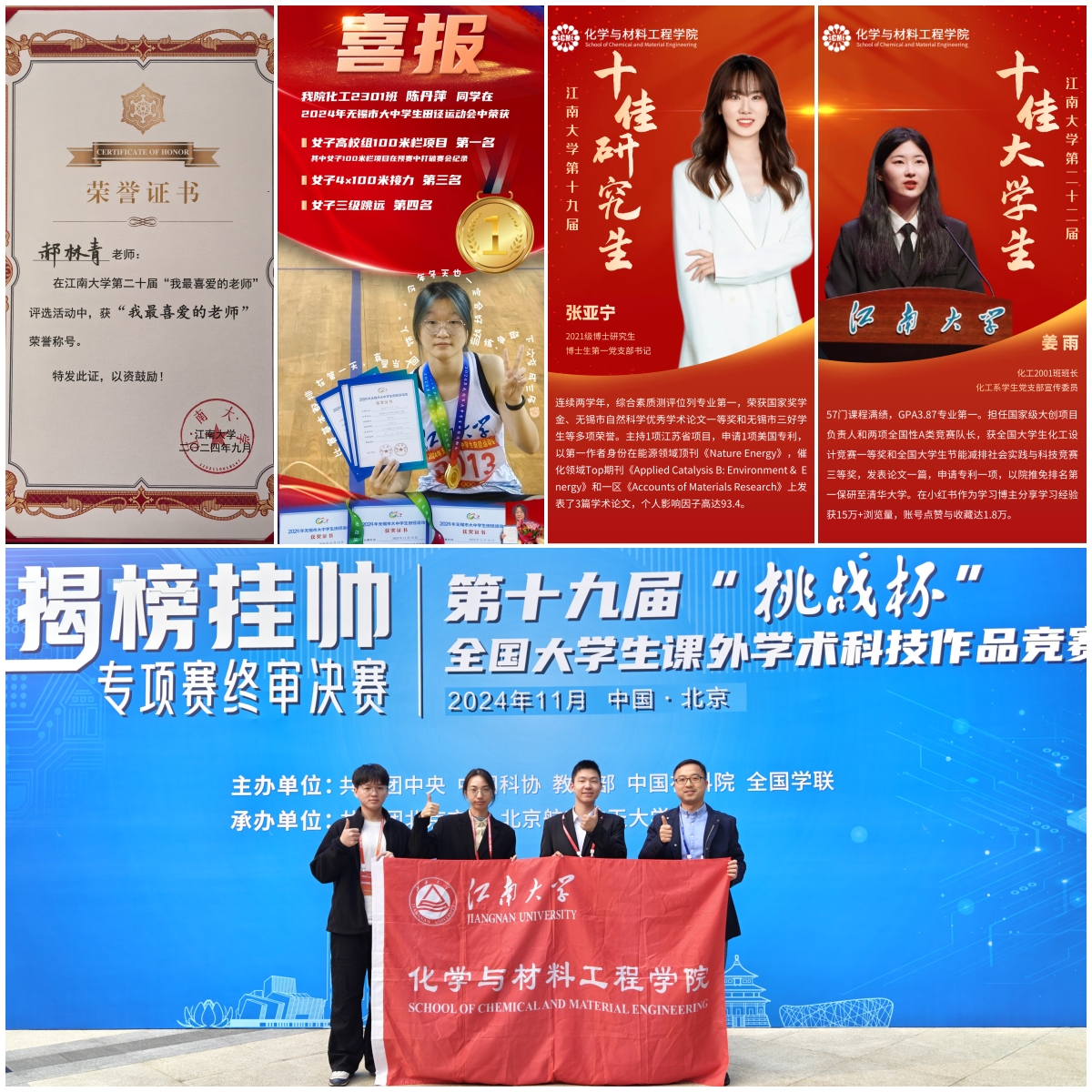 “十佳研究生”“十佳本科生”;化工2301班陈丹萍获2024年无锡市大中学生田径运动会女子高校组100米栏项目第一名。
