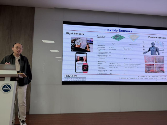 报告会首先由苏州大学功能纳米与软物质研究院姬少博教授带来题为“柔性/软硬连接中的高分子界面工程”专题报告。姬教授围绕柔性传感器在集成制造中面临的界面薄弱问题展开,介绍了团队通过界面共价反应和超分子化学手段显著增强不同材料之间的结合力,提出“柔性焊接”与“柔性焊料”等创新策略,为提升柔性传感设备的稳定性和耐用性提供了新的材料解决方案。