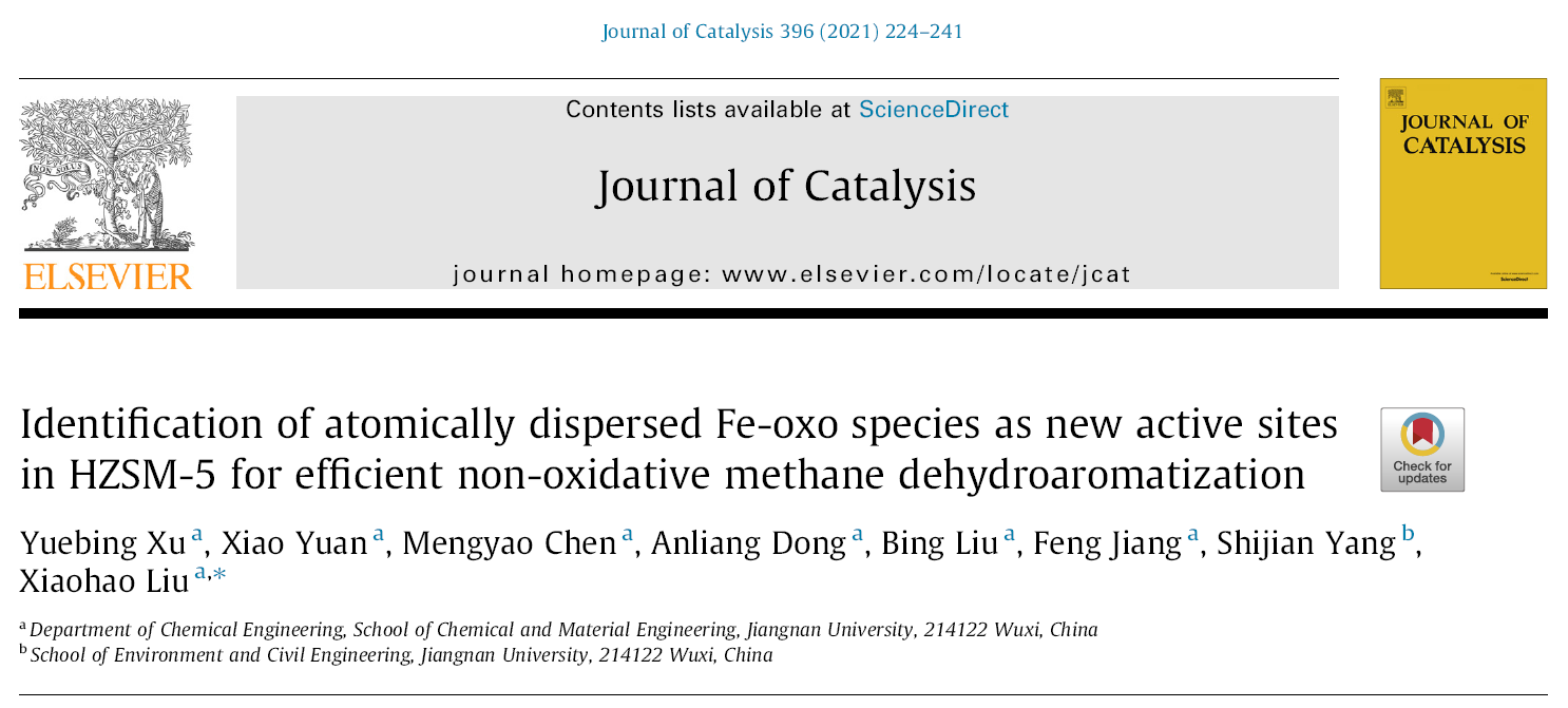 近日,我校化工学院刘小浩教授团队在揭示甲烷无氧催化转化制芳烃的新的活性中心的研究中取得重要进展,研究成果以题为“Identification of atomically dispersed Fe-oxo species as new active sites in HZSM-5 for efficient non-oxidative methane dehydroaromatization”发表在催化领域权威期刊Journal of CatalysisJ. Catal.,2021,396, 224-241)。该论文化工学院胥月兵副教授为第一作者,刘小浩教授为通讯作者。