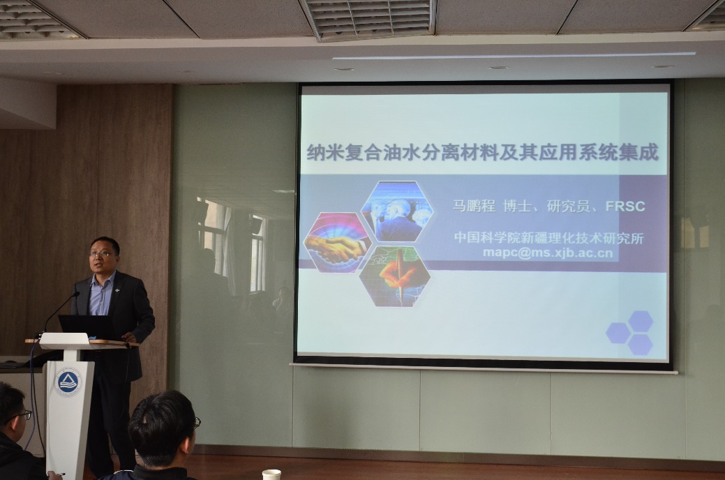 2021年4月8日,中国科学院新疆理化技术研究所马鹏程研究员应邀来91视频 访问,并在91视频 A316学术报告厅做了题为“纳米复合油水分离材料及其应用系统集成”的精彩报告。马丕明教授主持了报告会,并对马鹏程研究员的来访致以热烈的欢迎。马鹏程研究员主要围绕纳米复合油水分离材料及其应用系统集成的最新研究进行展开,重点介绍以改性和复合技术为基础的新型油水分离用高分子纳米复合材料的设计思路和制备过程,并以所得材料作为油-水分离设备核心组件应用于不同行业的油-水分离过程。这将对提高环境资源利用率以及污染物治理具有重要意义。报告会吸引了众多师生前来参加,现场气氛十分活跃,相互间进行了广泛的讨论与交流。