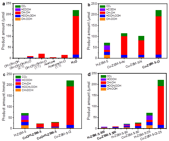 图2.溶剂水(a)、氯(b)和铜物种状态(c,d)对甲烷低温H2O2氧化制甲醇的反应性能的影响