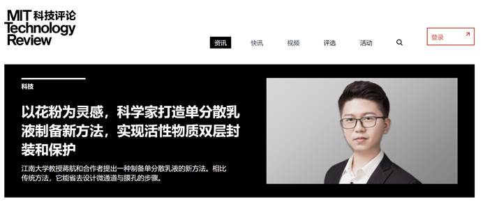 青年教师蒋航进行了专题采访,并以封面形式发表于中国官方网站及公众号。该采访的主题为“以花粉为灵感,科学家打造单分散乳液制备新方法,实现活性物质双层封装和保护”,重点报道了蒋航老师近期在单分散Pickering乳液制备方面的最新研究成果及未来研究设想。