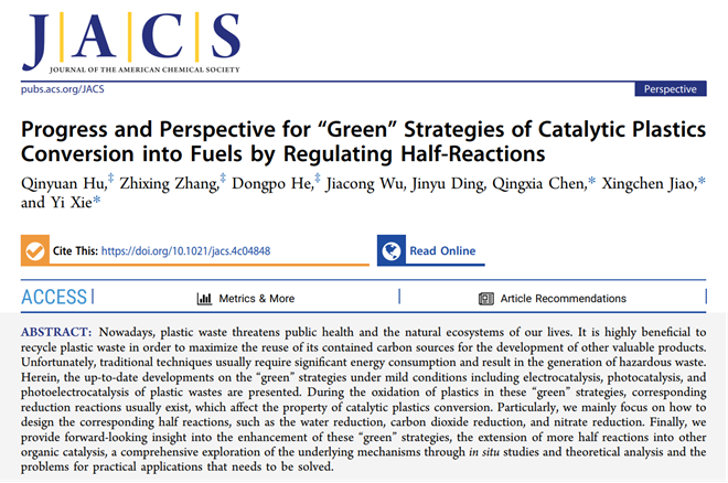 近期,91视频 焦星辰教授、陈庆霞副教授与中国科学技术大学谢毅院士合作,在温和条件下塑料催化转化方面发表重要观点论文,相关工作在J. Am. Chem. Soc.”上发表:Progress and Perspective for “Green” Strategies of Catalytic Plastics Conversion into Fuels by Regulating Half-ReactionsJ. Am. Chem. Soc.每年发表论文3千余篇,其中仅20篇左右是由主编亲自邀请各重要前沿分支的领军学者,就领域性进展和前瞻撰写的Perspective文章,其对学科发展的重要意义和权威性不言而喻。该论文化工学院2022级硕士研究生胡秦源、2023级硕士研究生张志兴和2023级博士生何东坡为共同第一作者。