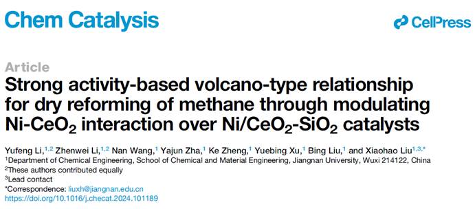 这一成果近期以题为“Strong activity-based volcano-type relationship for dry reforming of methane through modulating Ni-CeO2interaction over Ni/CeO2-SiO2catalysts”发表在Chem Catalysis期刊上。上述工作得到国家自然科学基金面上项目(22379053,21878127)等项目的资助。