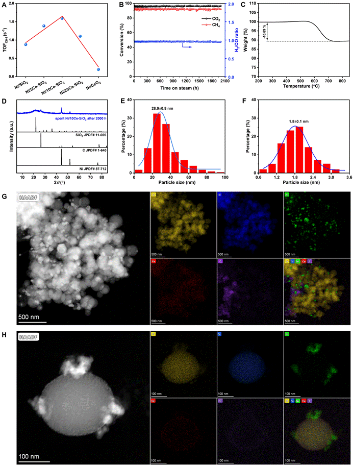 图2. Ni纳米粒子与CeO2的相互作用对CH4干重整催化活性和稳定性的影响,(A)反应活性与CeO2纳米岛含量的火山型曲线关系、(B)2000 h催化剂稳定性测试结果,长周期反应后催化剂的表征(C)热重分析、(D)XRD、(E,F)Ni和CeO2的粒径分布,以及(G,H)HADFF-STEM和元素Mapping表征。