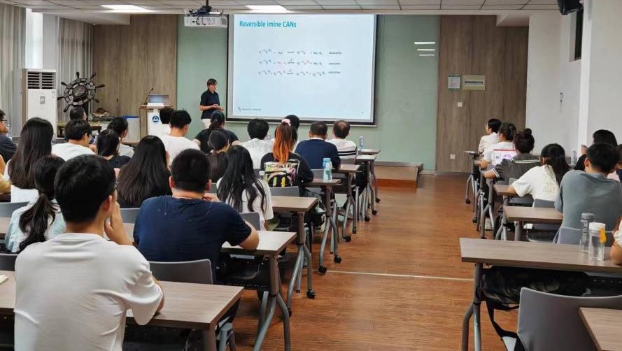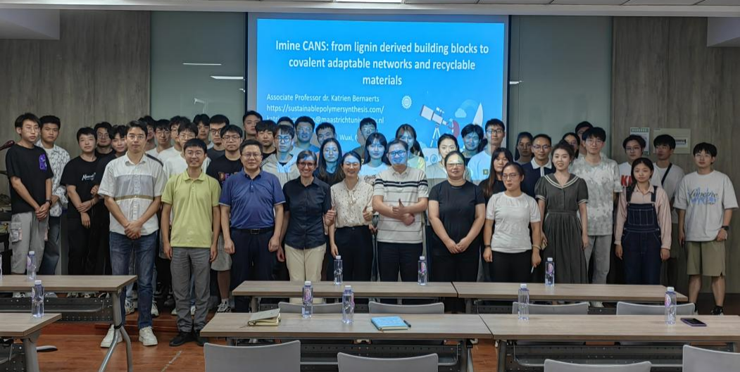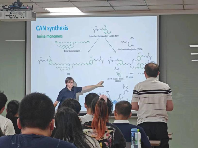 师生进行了广泛的学术讨论与交流。会议由黄晶副教授主持,她首先对KatrienBernaerts进行了介绍并对其到访表示诚挚的敬意与欢迎。Katrien以循环经济与可持续聚合物材料的研究为大背景,主要围绕由木质素及其衍生结构构建的共价适应性网络和可回收材料的最新研究进行展开,重点从木质素亚胺Vitrimer的制备作为导向切入点,通过改性木质素得到富含亚胺动态共价键的木质素基Vitrimer,充分发挥亚胺键独特的动态交换和水解性,使其显示出优异的自修复、自清洁和可回收等特性。这些工作有助于系统的可持续性和循环性,为绿色发展领域的环境可持续战略提供了一条有希望的途径。此次报告会以全英文形式进行,吸引了众多师生前来参加,学术氛围浓厚。