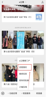 手机关注“e江南”微信公众号,点击屏幕下方“校园服务”中的“访客预约”,进入后点击“我的预约”,点击“查看访客码”即可获得访客码。进入校园时出示访客码。
