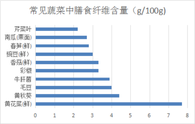 嫩茎、叶、花菜类蔬菜(如油菜、菠菜、西蓝花)富含b-胡萝卜素、维生素C、维生素B2、矿物质;叶类蔬菜的维生素含量一般高于根茎部和瓜菜类。蔬菜中的膳食纤维含量一般在2%左右。