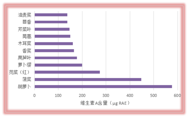 植物性食物中的β-胡萝卜素可以转化为维生素A,是我国居民膳食维生素A的主要来源。图3是一些常见深色蔬菜中的维生素A生物活动当量,中国居民维生素A推荐摄入量(RNI)成年女性和男性分别为700、800 µgRAE/d,100g胡萝卜中基本可以达到成年女性一天的维生素A需要量的83%。