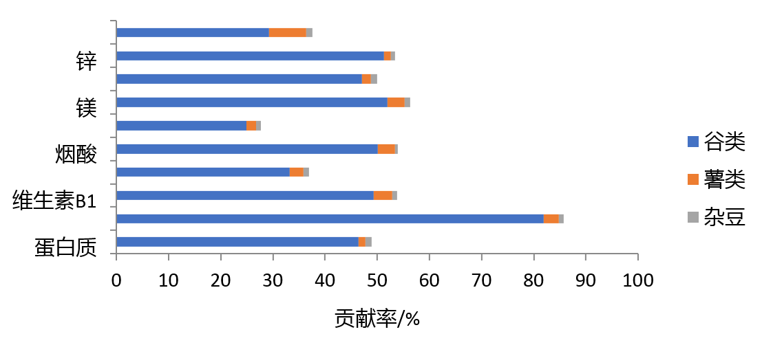谷薯杂豆类食物是碳水化合物、蛋白质、B族维生素、部分矿物质和膳食纤维的良好来源。根据2015—2017年中国居民营养与健康状况监测数据,我国居民谷薯类及杂豆类食物提供的营养素对膳食的贡献率见图2。