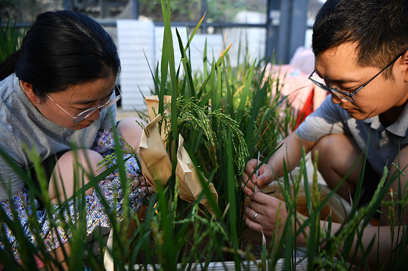 2020年1月11日,科研人员在位于海南省陵水黎族自治县的华中农业大学水稻南繁基地温室内工作。新华社记者 郭程 摄