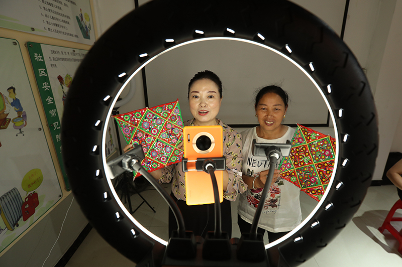 7月5日,在贵州省黔东南苗族侗族自治州榕江县场坝社区服务中心网络直播营销技能培训教室里,学员在直播营销刺绣手工艺品。新华社发(李长华 摄)
