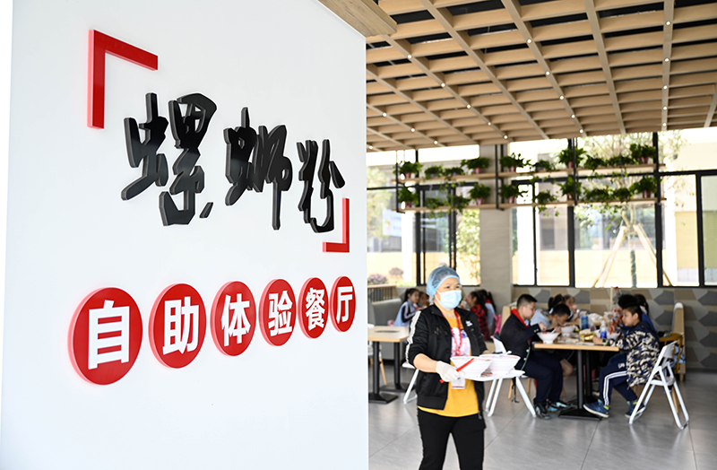 4月29日,在广西柳州螺蛳粉产业园,参加研学团的学生在一家螺蛳粉企业里品尝螺蛳粉。新华社发(黎寒池 摄)
