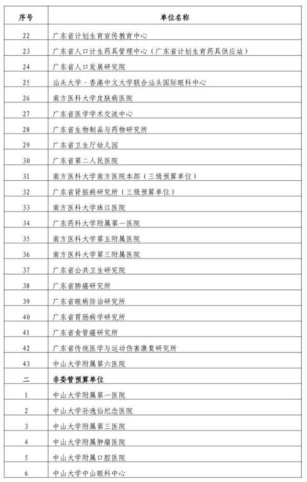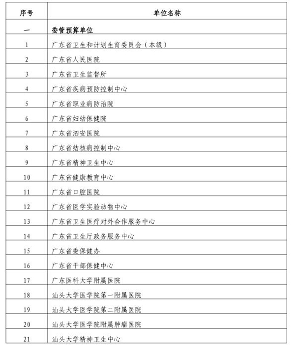 省卫生计生委2018年部门预算公开主要包括41个委管二级预算单位、2个委管三级预算单位和6个非委管预算单位的汇总预算数,委管二级预算单位比2017年减少1个单位(广东省医药采购中心),纳入省卫生计生委2018年部门预算汇编的预算单位如下: