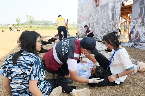 紧急医学救援队员在房屋坍塌场景开展救援演练